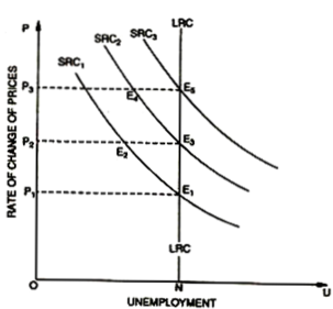 The long-run Phillips Curve LRC is in this manner vertical at point N, and is taken to be the regular rate of unemployment, as controlled by typical contacts in the work showcase. A consequent exertion to decrease unemployment with further swelling by raising costs from P2 to P3 may again be effective in the short-run, making the rate of unemployment decay along SRC2 to E4 from E3.
